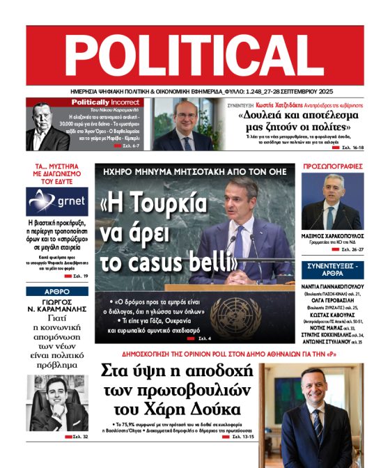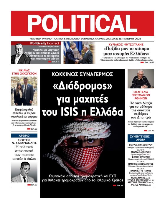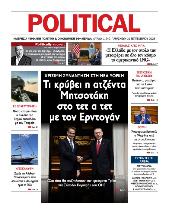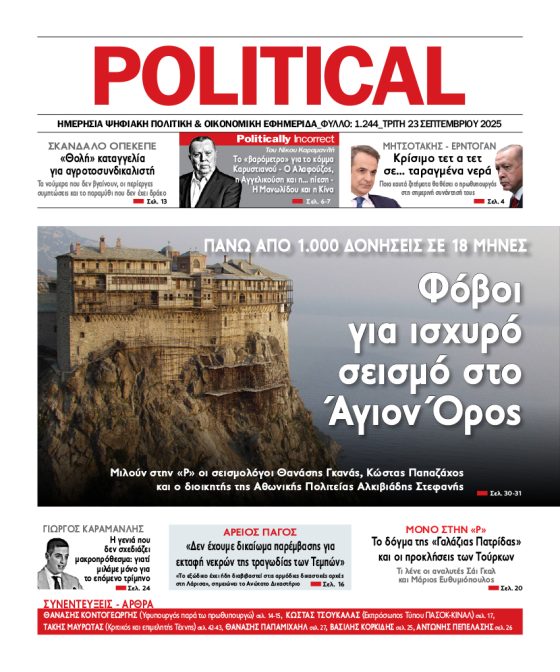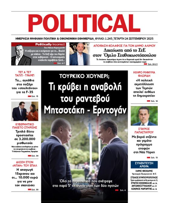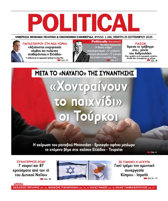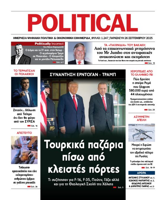 Δείτε περισσότερα Εφημερίδα Political 23.09.25 23 Σεπτεμβρίου, 2025 Πατήστε το εικονίδιο και διαβάστε την εφημερίδα σε μορφή PDFΔείτε περισσότερα Share 0 0 0 0 0 0 0 0