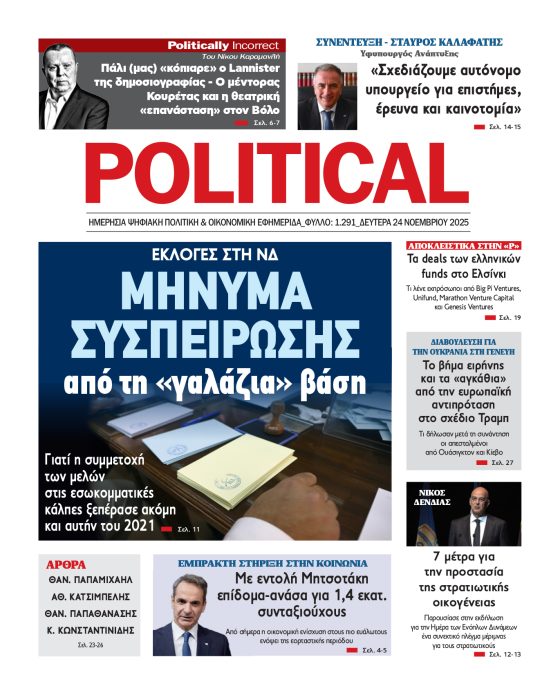 Δείτε περισσότερα Εφημερίδα Political 22.11.25 22 Νοεμβρίου, 2025 Πατήστε το εικονίδιο και διαβάστε την εφημερίδα σε μορφή PDFΔείτε περισσότερα Share 0 0 0 0 0 0 0 0