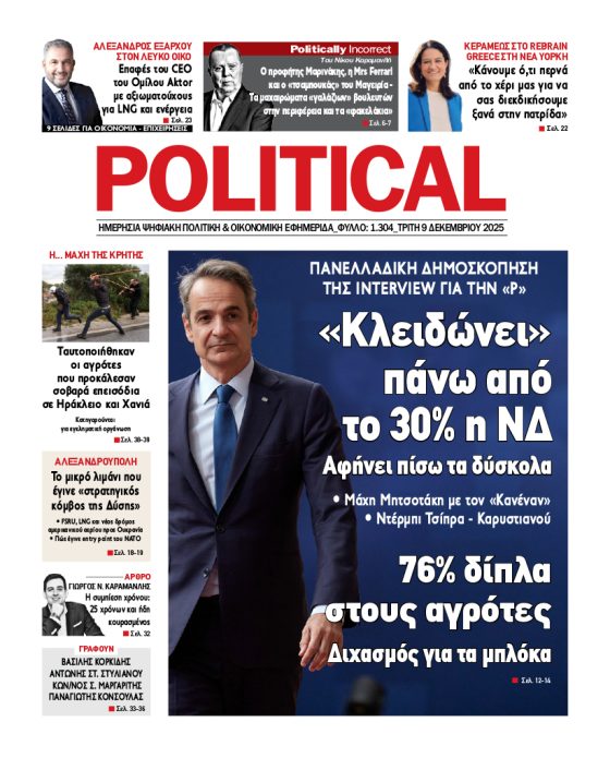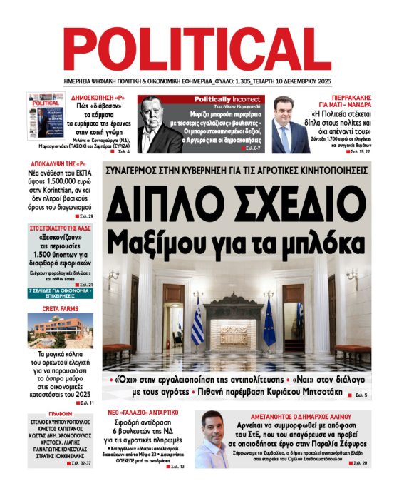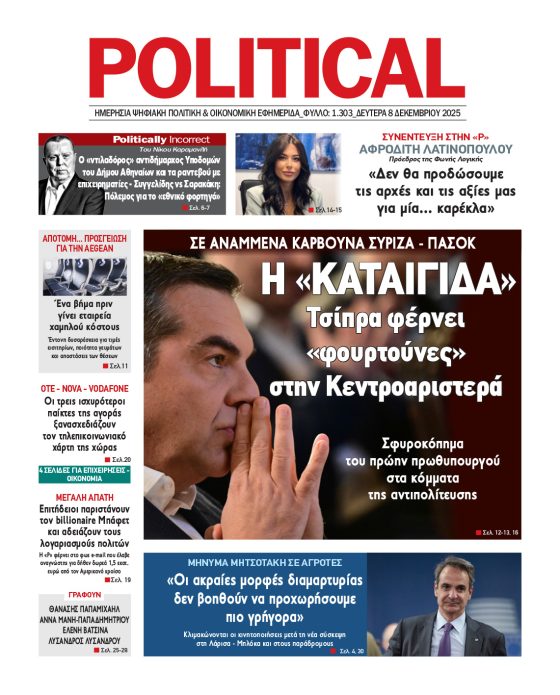 Δείτε περισσότερα Εφημερίδα Political 08.12.25 8 Δεκεμβρίου, 2025 Πατήστε το εικονίδιο και διαβάστε την εφημερίδα σε μορφή PDFΔείτε περισσότερα Share 0 0 0 0 0 0 0 0