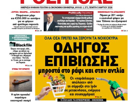 ΕφημερίδαPolitical 06.03.266 Μαρτίου, 2026 Total 0 Shares Share 0 Tweet 0 Share 0 Share 0 Share 0 Share 0 Share 0 Share 0 Πατήστε το εικονίδιο και διαβάστε την εφημερίδα σε μορφή PDF Total 0 Shares Share 0 Tweet 0 Pin it 1 Προηγούμενο άρθρο Εφημερίδα Political 05.03.26 5 Μαρτίου, 2026 Δείτε περισσότερα Εγγραφή ΕΓΓΡΑΦΕΙΤΕ ΣΤΟ NEWSLETTER ΜΑΣ Subscribe ΕΠΙΛΕΓΟΝΤΑΣ ΑΥΤΟ ΤΟ ΠΛΑΙΣΙΟ, ΕΠΙΒΕΒΑΙΩΝΕΤΕ ΟΤΙ ΕΧΕΤΕ ΔΙΑΒΑΣΕΙ ΚΑΙ ΑΠΟΔΕΧΕΣΤΕ ΤΟΥΣ ΟΡΟΥΣ ΧΡΗΣΗΣ ΜΑΣ ΣΧΕΤΙΚΑ ΜΕ ΤΗΝ ΑΠΟΘΗΚΕΥΣΗ ΤΩΝ ΔΕΔΟΜΕΝΩΝ ΠΟΥ ΥΠΟΒΑΛΛΟΝΤΑΙ ΜΕΣΩ ΑΥΤΗΣ ΤΗΣ ΦΟΡΜΑΣ. Σύμφωνα με τον Κανονισμό ΕΕ 2016/679 του Ευρωπαϊκού Κοινοβουλίου {Γενικός Κανονισμός Προστασίας Προσωπικών Δεδομένων (GDPR)} που έχει τεθεί σε ισχύ από τις 25 Μαΐου 2018, και του Ν.4624/2019 που έχει τεθεί σε ισχύ από 29/8/2019, απαιτείται η συγκατάθεσή σας για να μετέχετε στην επικοινωνία με την παρούσα διεύθυνση ηλεκτρονικού ταχυδρομείου ή το κινητό σας τηλέφωνο. Σε περίπτωση που δεν επιθυμείτε να λαμβάνετε μηνύματα και ενημερώσεις από την παρούσα ηλεκτρονική διεύθυνση ή/και δεν επιθυμείτε να τηρούμε αρχείο της διεύθυνσης ηλεκτρονικού ταχυδρομείου ή και του αριθμού του κινητού σας τηλεφώνου, μπορείτε να ασκήσετε τα δικαιώματά σας βάσει του άρθρου 13,παρ.2, του Κανονισμού ΕΕ 2016/679 και να διαγραφείτε κάνοντας κλικ στο link που ακολουθεί. Σας ενημερώνουμε επίσης ότι η διεύθυνση ηλεκτρονικού σας ταχυδρομείου ή το κινητό σας τηλέφωνο, παραμένουν απόρρητα και δεν γνωστοποιούνται σε τρίτους. Εάν λάβατε το μήνυμα αυτό κατά λάθος, παρακαλούμε δεχθείτε τις απολογίες μας για την ενόχληση. Δείτε επίσης... Δείτε περισσότερα Political 05.03.26 5 Μαρτίου, 2026 Δείτε περισσότερα Political 04.03.26 4 Μαρτίου, 2026 Δείτε περισσότερα Political 03.03.26 3 Μαρτίου, 2026 Δείτε περισσότερα Political 02.03.26 2 Μαρτίου, 2026 Δείτε περισσότερα Political 28.02.26 28 Φεβρουαρίου, 2026 Δείτε περισσότερα Political 27.02.26 27 Φεβρουαρίου, 2026 Δείτε περισσότερα Political 26.02.26 26 Φεβρουαρίου, 2026 Δείτε περισσότερα Political 25.02.26 25 Φεβρουαρίου, 2026