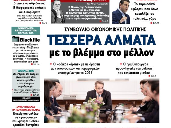 ΕφημερίδαPolitical 26.02.2626 Φεβρουαρίου, 2026 Total 0 Shares Share 0 Tweet 0 Share 0 Share 0 Share 0 Share 0 Share 0 Share 0 Πατήστε το εικονίδιο και διαβάστε την εφημερίδα σε μορφή PDF Total 1 Shares Share 0 Tweet 0 Pin it 1 Προηγούμενο άρθρο Εφημερίδα Political 25.02.26 25 Φεβρουαρίου, 2026 Δείτε περισσότερα Εγγραφή ΕΓΓΡΑΦΕΙΤΕ ΣΤΟ NEWSLETTER ΜΑΣ Subscribe ΕΠΙΛΕΓΟΝΤΑΣ ΑΥΤΟ ΤΟ ΠΛΑΙΣΙΟ, ΕΠΙΒΕΒΑΙΩΝΕΤΕ ΟΤΙ ΕΧΕΤΕ ΔΙΑΒΑΣΕΙ ΚΑΙ ΑΠΟΔΕΧΕΣΤΕ ΤΟΥΣ ΟΡΟΥΣ ΧΡΗΣΗΣ ΜΑΣ ΣΧΕΤΙΚΑ ΜΕ ΤΗΝ ΑΠΟΘΗΚΕΥΣΗ ΤΩΝ ΔΕΔΟΜΕΝΩΝ ΠΟΥ ΥΠΟΒΑΛΛΟΝΤΑΙ ΜΕΣΩ ΑΥΤΗΣ ΤΗΣ ΦΟΡΜΑΣ. Σύμφωνα με τον Κανονισμό ΕΕ 2016/679 του Ευρωπαϊκού Κοινοβουλίου {Γενικός Κανονισμός Προστασίας Προσωπικών Δεδομένων (GDPR)} που έχει τεθεί σε ισχύ από τις 25 Μαΐου 2018, και του Ν.4624/2019 που έχει τεθεί σε ισχύ από 29/8/2019, απαιτείται η συγκατάθεσή σας για να μετέχετε στην επικοινωνία με την παρούσα διεύθυνση ηλεκτρονικού ταχυδρομείου ή το κινητό σας τηλέφωνο. Σε περίπτωση που δεν επιθυμείτε να λαμβάνετε μηνύματα και ενημερώσεις από την παρούσα ηλεκτρονική διεύθυνση ή/και δεν επιθυμείτε να τηρούμε αρχείο της διεύθυνσης ηλεκτρονικού ταχυδρομείου ή και του αριθμού του κινητού σας τηλεφώνου, μπορείτε να ασκήσετε τα δικαιώματά σας βάσει του άρθρου 13,παρ.2, του Κανονισμού ΕΕ 2016/679 και να διαγραφείτε κάνοντας κλικ στο link που ακολουθεί. Σας ενημερώνουμε επίσης ότι η διεύθυνση ηλεκτρονικού σας ταχυδρομείου ή το κινητό σας τηλέφωνο, παραμένουν απόρρητα και δεν γνωστοποιούνται σε τρίτους. Εάν λάβατε το μήνυμα αυτό κατά λάθος, παρακαλούμε δεχθείτε τις απολογίες μας για την ενόχληση. Δείτε επίσης... Δείτε περισσότερα Political 25.02.26 25 Φεβρουαρίου, 2026 Δείτε περισσότερα Political 24.02.26 24 Φεβρουαρίου, 2026 Δείτε περισσότερα Political 21.02.26 21 Φεβρουαρίου, 2026 Δείτε περισσότερα Political 20.02.26 20 Φεβρουαρίου, 2026 Δείτε περισσότερα Political 19.02.26 19 Φεβρουαρίου, 2026 Δείτε περισσότερα Political 18.02.26 18 Φεβρουαρίου, 2026 Δείτε περισσότερα Political 17.02.26 17 Φεβρουαρίου, 2026 Δείτε περισσότερα Political 16.02.26 16 Φεβρουαρίου, 2026